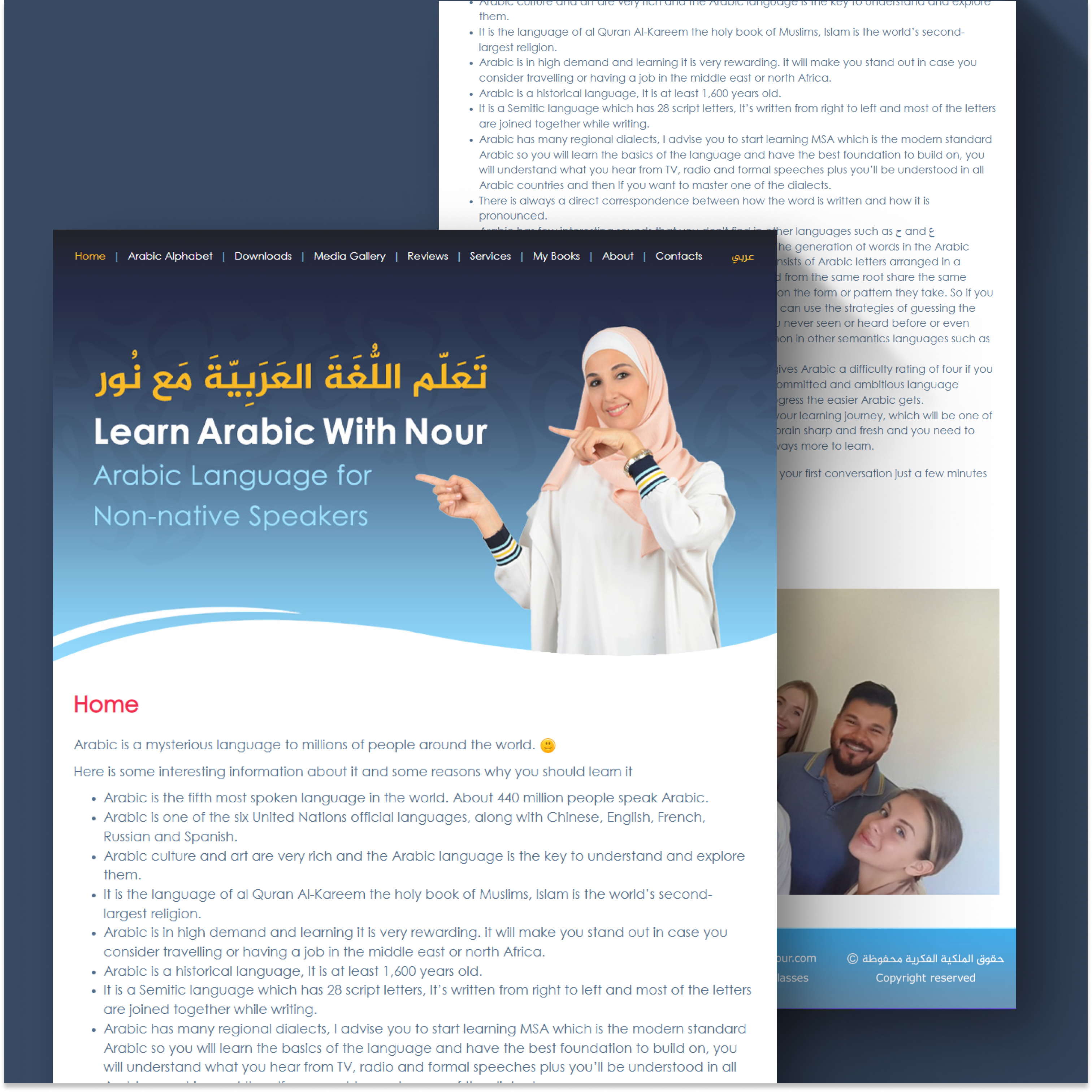 Learn With Nour, a teacher website that offers books, courses, and a gallery of international students