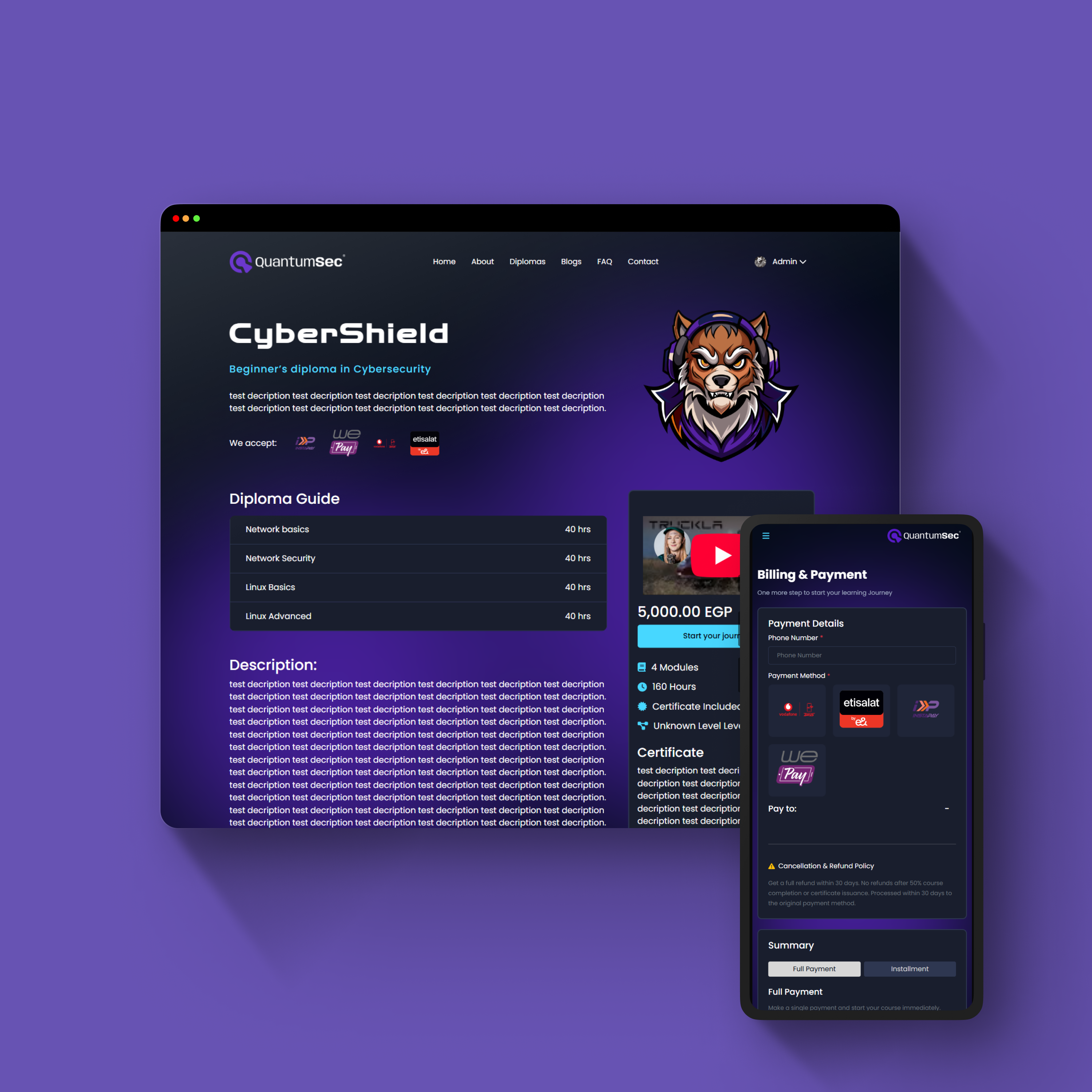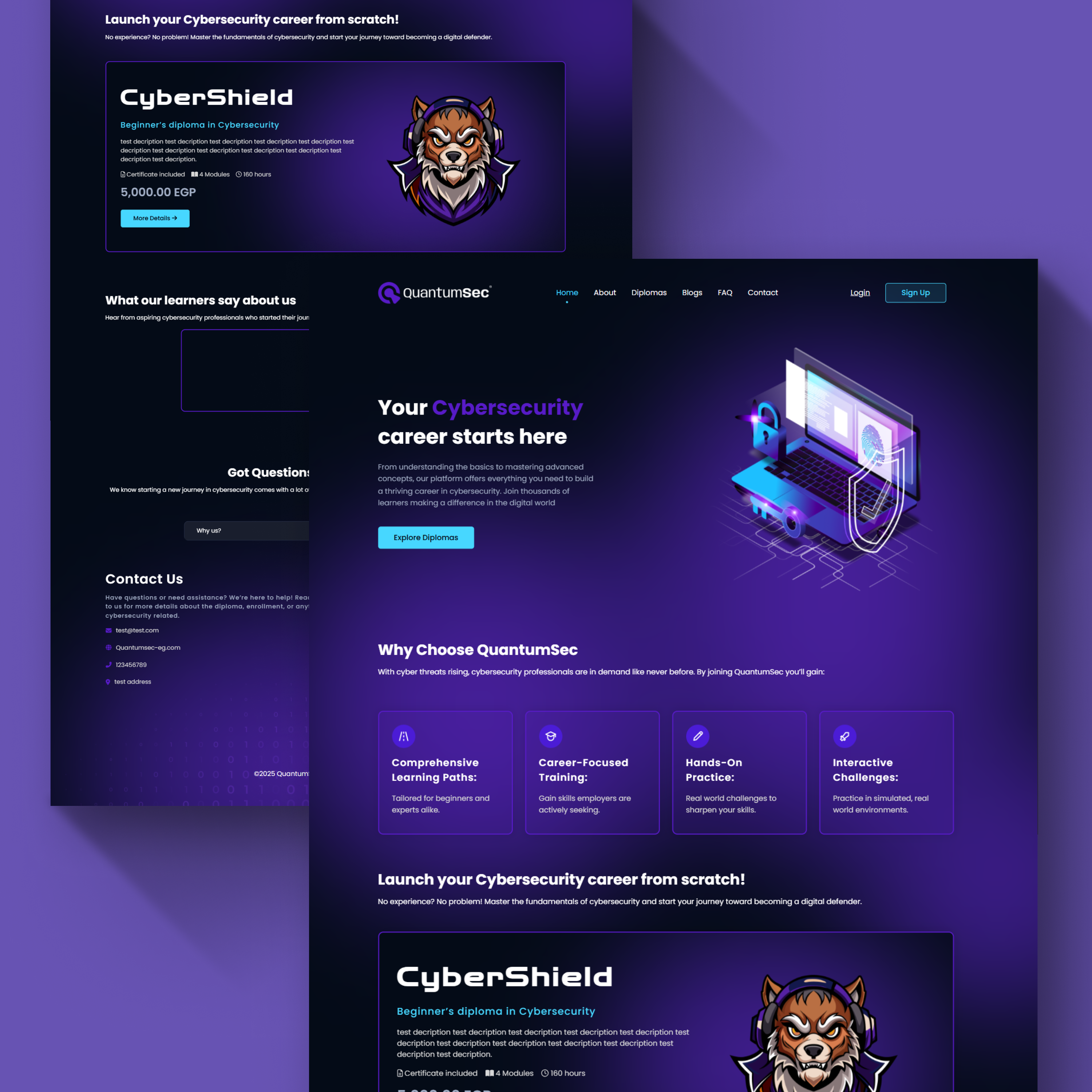 A website where Quantum Security Academy offers its courses and diplomas for students all around the world in a sleek, modern design